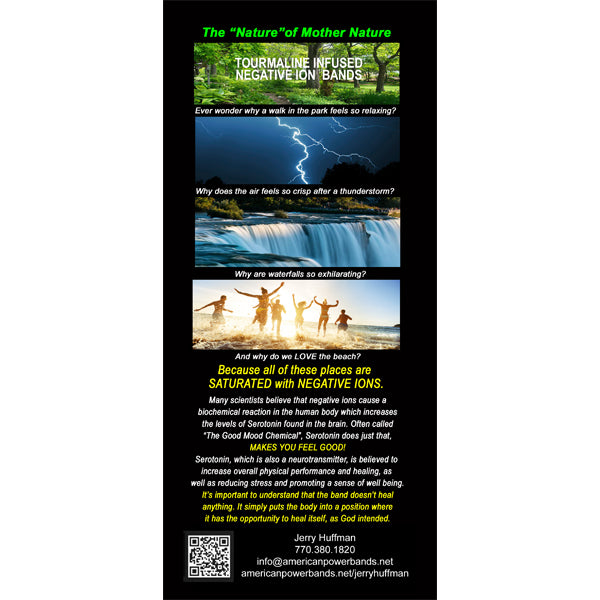 If you plan to do a fundraising project or sell retail we suggest that you use our promotional rack cards to help explain APB products. The front features our products. The back features reasons why negative ion bands are so popular.